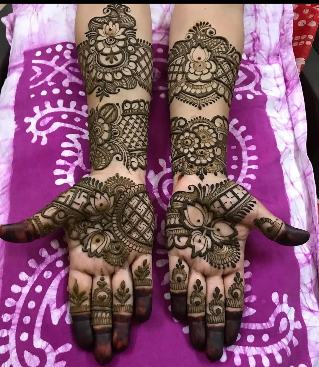 Full-Hand Coverage: Intricate patterns covering the entire back of the hand and extending to the forearm.