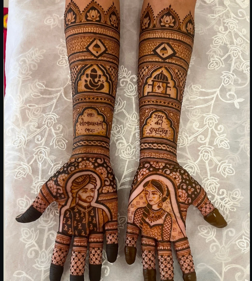 A fun and significant touch to bridal mehndi is adding a caricature of the bride (dulhan) and groom (dulha) to the design. These portraits are made with great precision and show the coming together of two people.