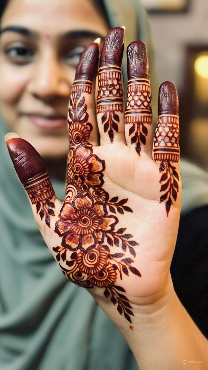 Sometimes, a few simple strokes on the fingers can make a statement. Tiny floral motifs, lines, or geometric patterns can enhance the fingers beautifully without covering the entire hand.